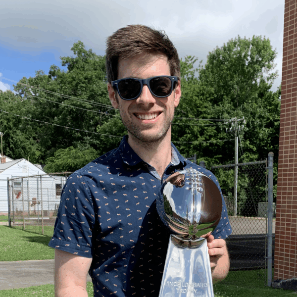 I am from the Charlotte area, by way of Frankfurt, Germany, Kileen, Texas, and a few other stops as I grew up an Army brat. I moved to Durham in 2011 after graduating from UNC Chapel Hill and have been here ever since. I live with my wife Hannah and our Great Pyrenees Maddie, and my favorite place to hang out in Durham is Beer Study with Hannah, Maddie, and/or an assortment of friends. One random fact that you should know about me is that like Chris Breslin I’m a Tampa Bay Buccaneer fan in Panthers territory, in part due to a brief stint in Florida during my childhood travels, and my 20+ years of fandom paid off in taking the Super Bowl trophy shown here (shoutout to Chris and Rachel Breslin for the connection!).